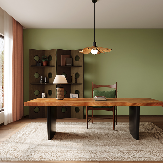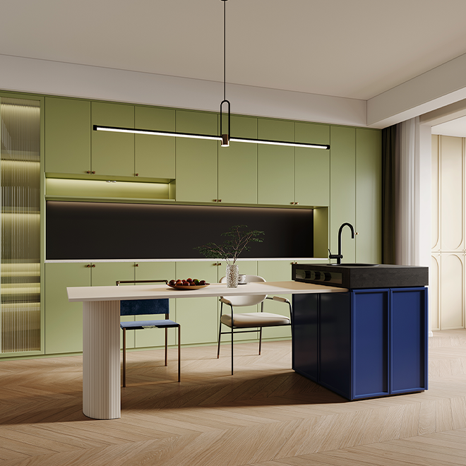 深邃的色彩源自浩瀚星空,暖白色的光線穿透空間,如同流星劃過天幕,閃耀著憧憬和期待。綠色與之相映成趣,賦予空間更加活躍而生動的魅力,讓思緒肆意飛揚。